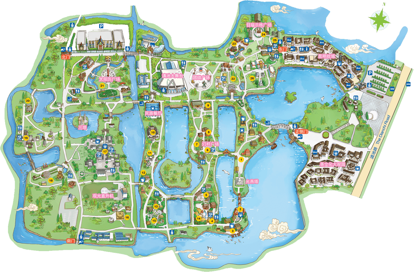 彝族在云南境內約471萬人,是省內人口最多、分布最廣的少數(shù)民族,主要聚居在金沙江、元江流域和哀牢山、無量山腹地。彝族是一個能歌善舞的民族,民間打歌、跳樂之風盛行,大三弦、跌腳舞久負盛名?;鸢压?jié)是彝族最具特色的民族節(jié)日。彝族村占地50余畝,三虎浮雕墻與虎頭內祖師形象表現(xiàn)了彝族虎鷹文化。太陽歷廣場圖騰柱上有太陽、虎、火和八卦圖形象,周圍環(huán)繞著10個朝向不同的月球造型,外圓周有12生肖石雕。依山而建的“...