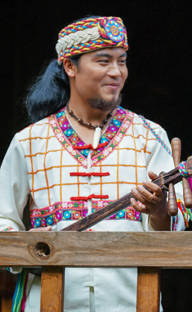 佤族人口約36萬,主要聚居在云南省瀾滄江南段以西的阿佤山區(qū)。佤族寨位于“翠漪洲”東南角。寨內分布有茅草頂?shù)母蓹谑浇ㄖ骸⑴n^廣場、神靈廣場、司崗里石雕以及糧倉等。牛頭廣場是佤族古老的剽牛活動場所,場正中的牛角為佤族的寨樁,廣場前的兩個石人分別為佤族的男性和女性祖先。神靈廣場表現(xiàn)了佤族萬物有靈、靈魂不死的自然崇拜觀念。場中兩個石人雕像分別為佤族最崇拜的“木依吉”和“阿依娥”。佤族木鼓舞節(jié)拍鮮明強烈,...